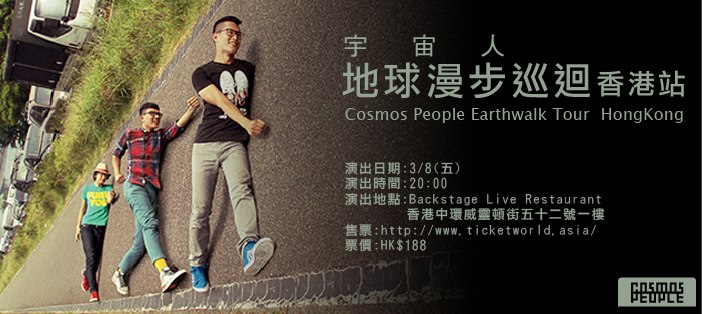 去年底推出新專輯《地球漫步》的宇宙人樂隊﹐三月底開始在台灣巡迴演出。經歷了更換團員、服兵役等事後﹐他們終於重新邁開步伐﹐繼續在地球上漫步。而香港也成為漫步路線的其中一站,比台灣的《如果不是你一起》巡演更早!而且更因三月八日的場次快速爆滿﹐立即加開了三月九日的第二場。可見香港樂迷對宇宙人的熱愛。